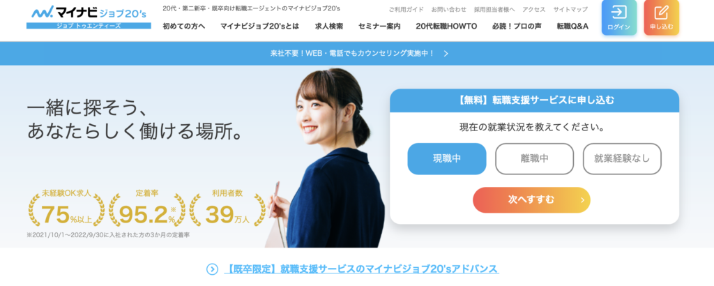 業界最大級の求人数を誇り、20代のキャリアアップ支援も積極的に行っています。専任のキャリアアドバイザーによる手厚いサポートも魅力の一つです。